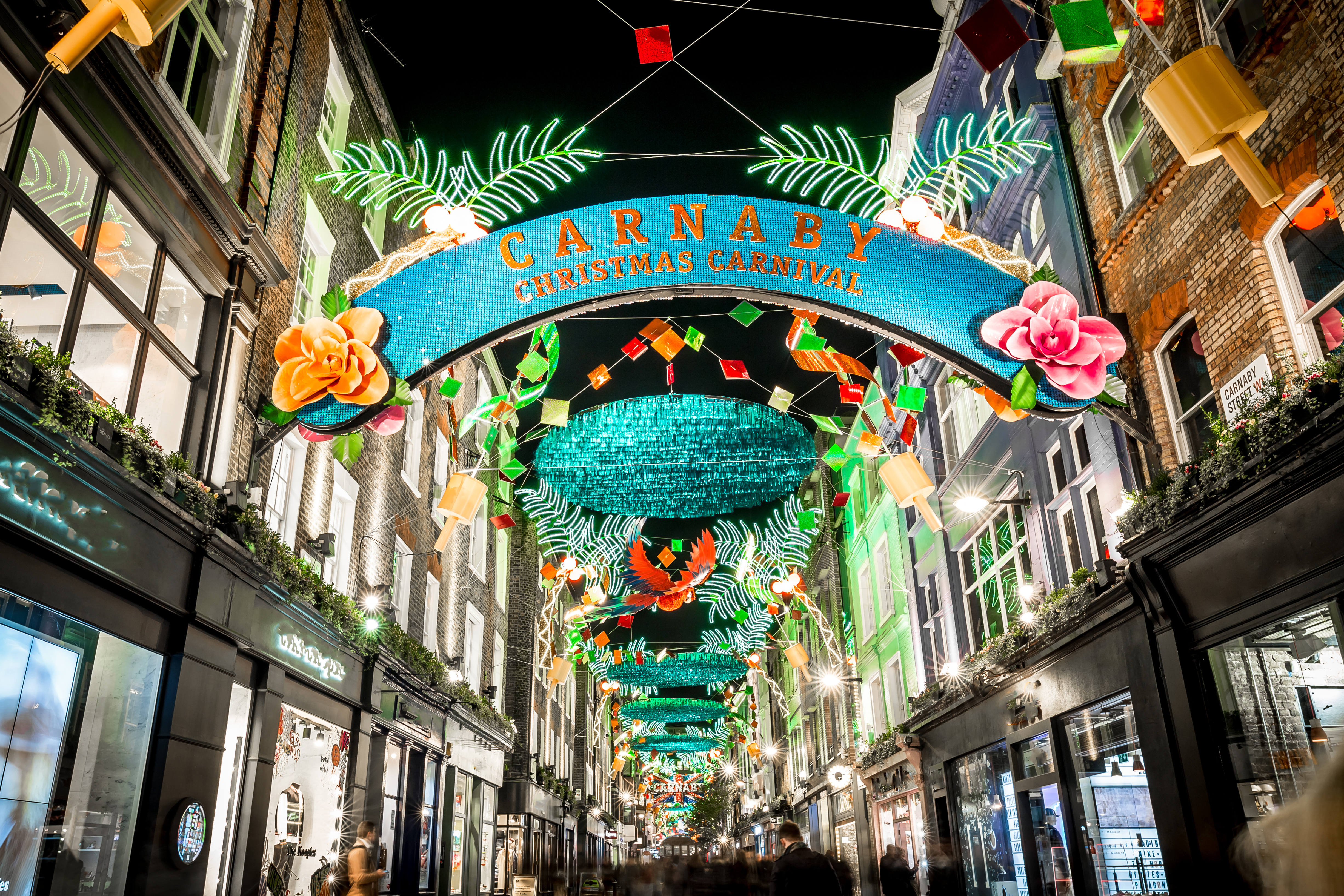 Carnaby Street in London mit bunter Beleuchtung zur Winterzeit